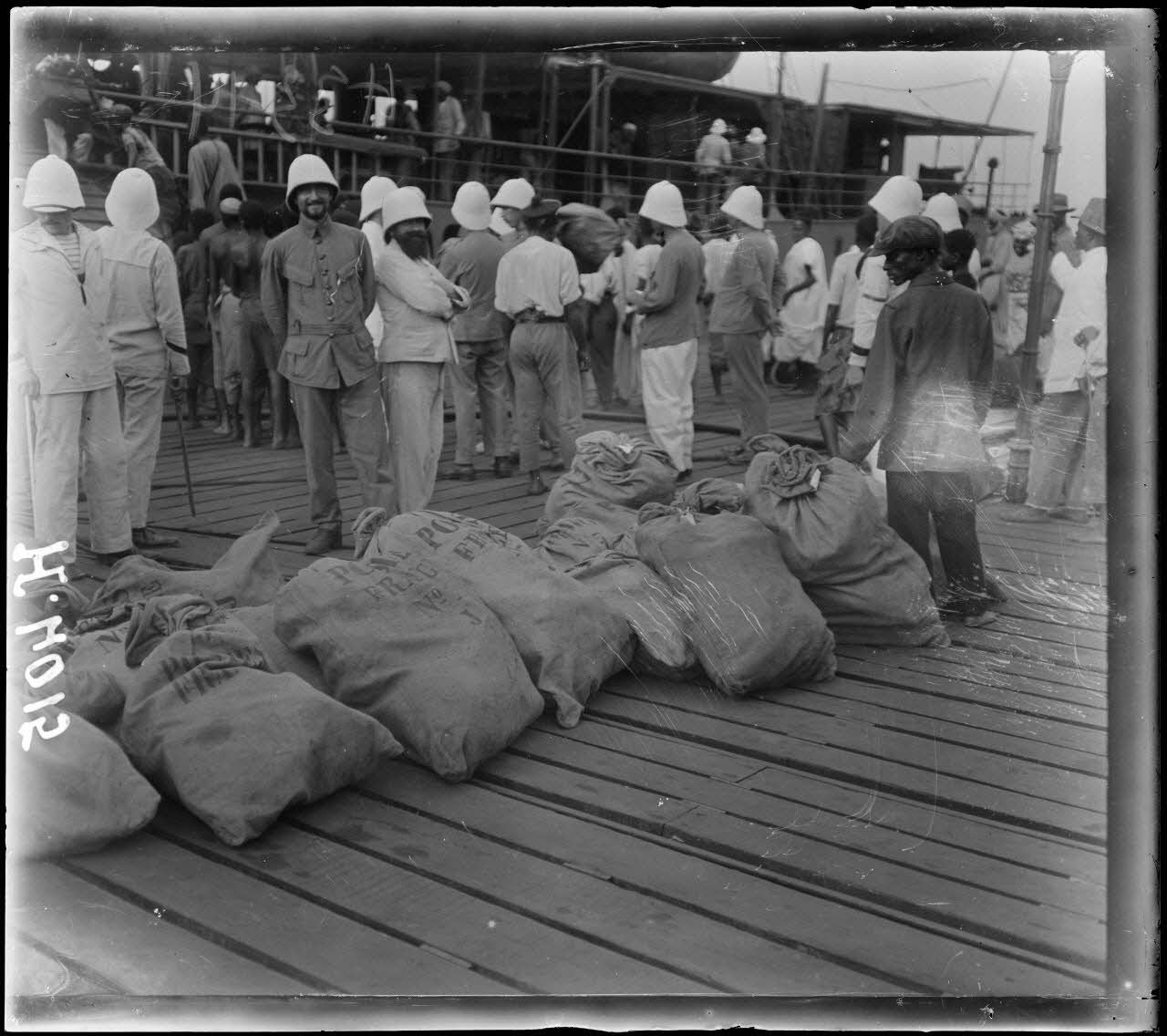 Douala. La "Margareth Elizabeth" va accoster au wharf, colons et militaires attendent.