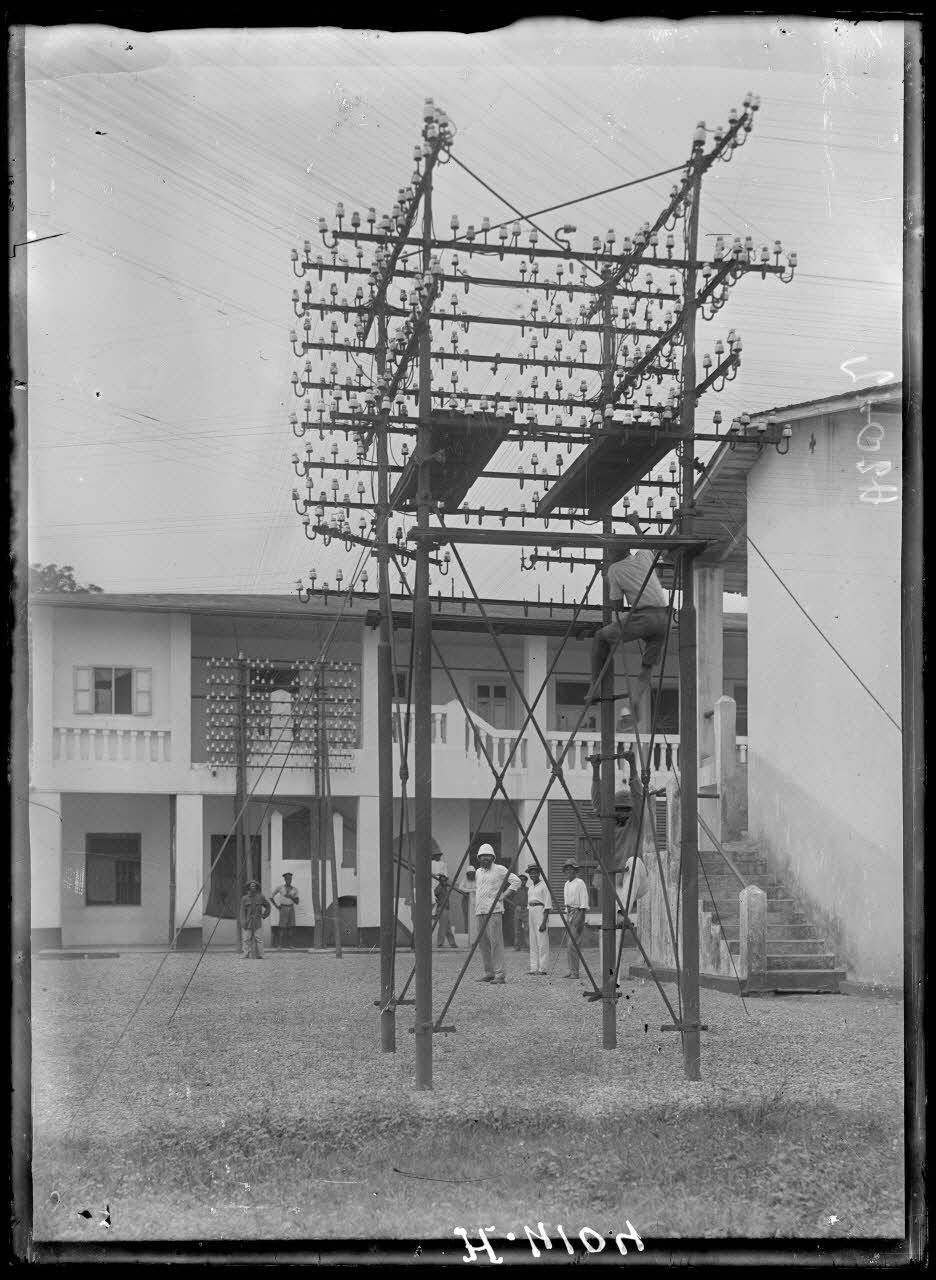 Douala. L'antenne de T.S.F. détruite le 29 septembre 1914. Poste des appareils et piliers d'ancrage.