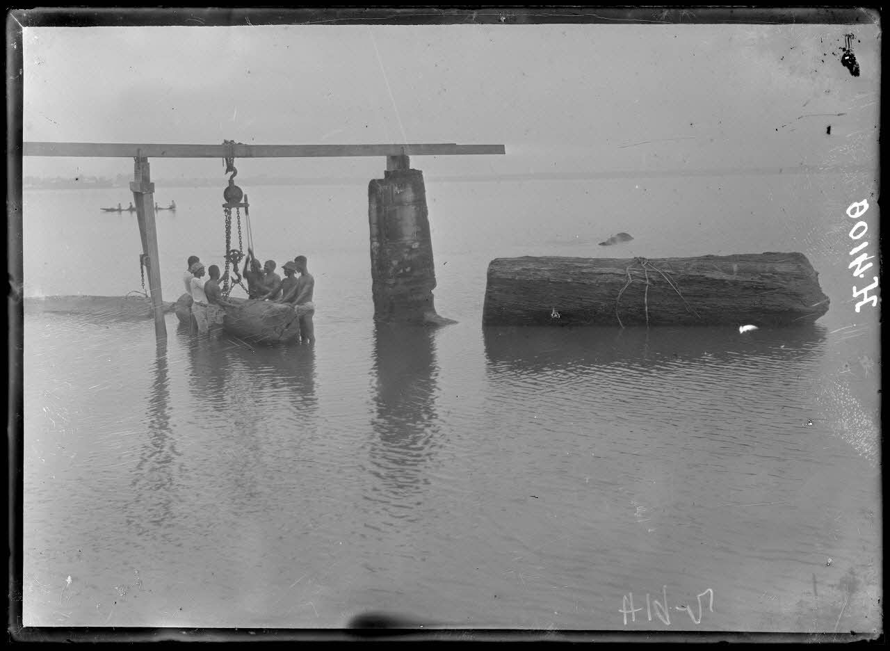 Douala. La scierie. Hissage d'une bille de bois. [légende d'origine]