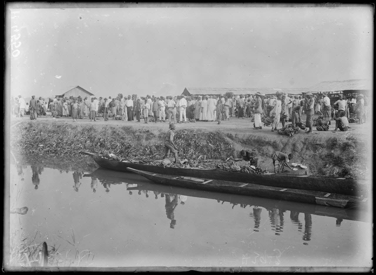 Des pirogues apportent des régimes de bananes au marché de Douala, où circule une foule nombreuse.