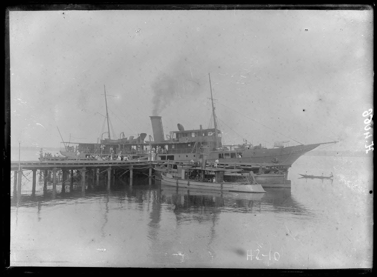 Dans le port de Douala, la "Margareth Elizabeth", un patrouilleur qui était le yacht du gouverneur allemand de la colonie, est amarré au bout du wharf.