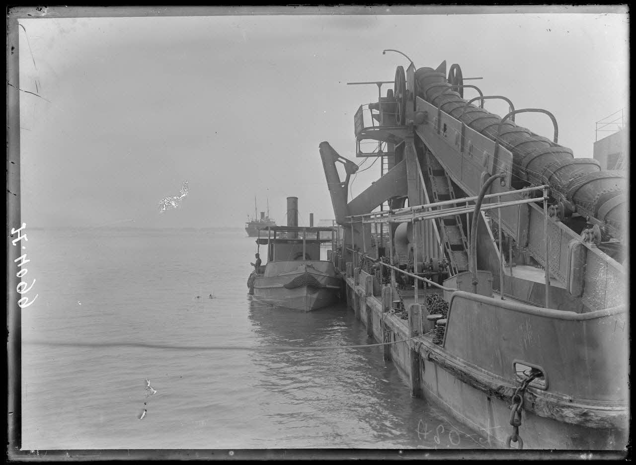 - Sur les docks flottants, près des dragues, le bâtiment "Odin" (qui cherche à couler la canonnière anglaise "Dwarf" en octobre 1914) est en cours de réparation. Sur les quais, les ateliers assistent les réparations. Dans la scierie, une bille de bois est hissée puis mise sur un chariot