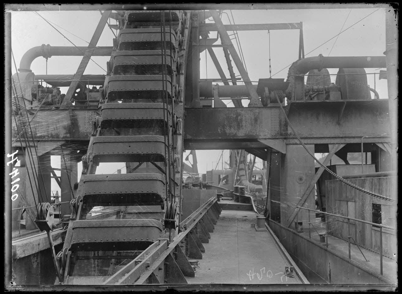 - Sur les docks flottants, près des dragues, le bâtiment "Odin" (qui cherche à couler la canonnière anglaise "Dwarf" en octobre 1914) est en cours de réparation. Sur les quais, les ateliers assistent les réparations. Dans la scierie, une bille de bois est hissée puis mise sur un chariot