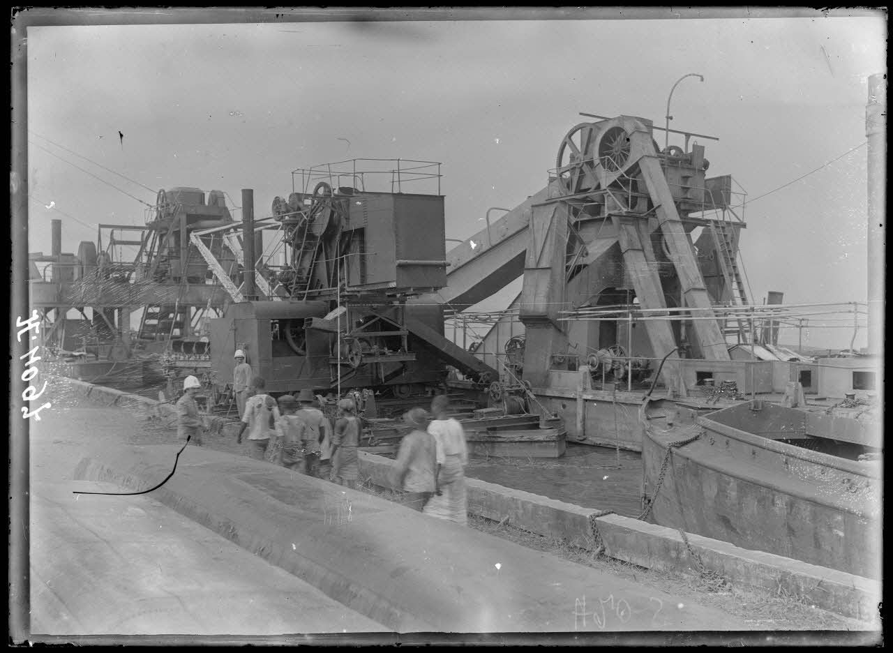 - Sur les docks flottants, près des dragues, le bâtiment "Odin" (qui cherche à couler la canonnière anglaise "Dwarf" en octobre 1914) est en cours de réparation. Sur les quais, les ateliers assistent les réparations. Dans la scierie, une bille de bois est hissée puis mise sur un chariot