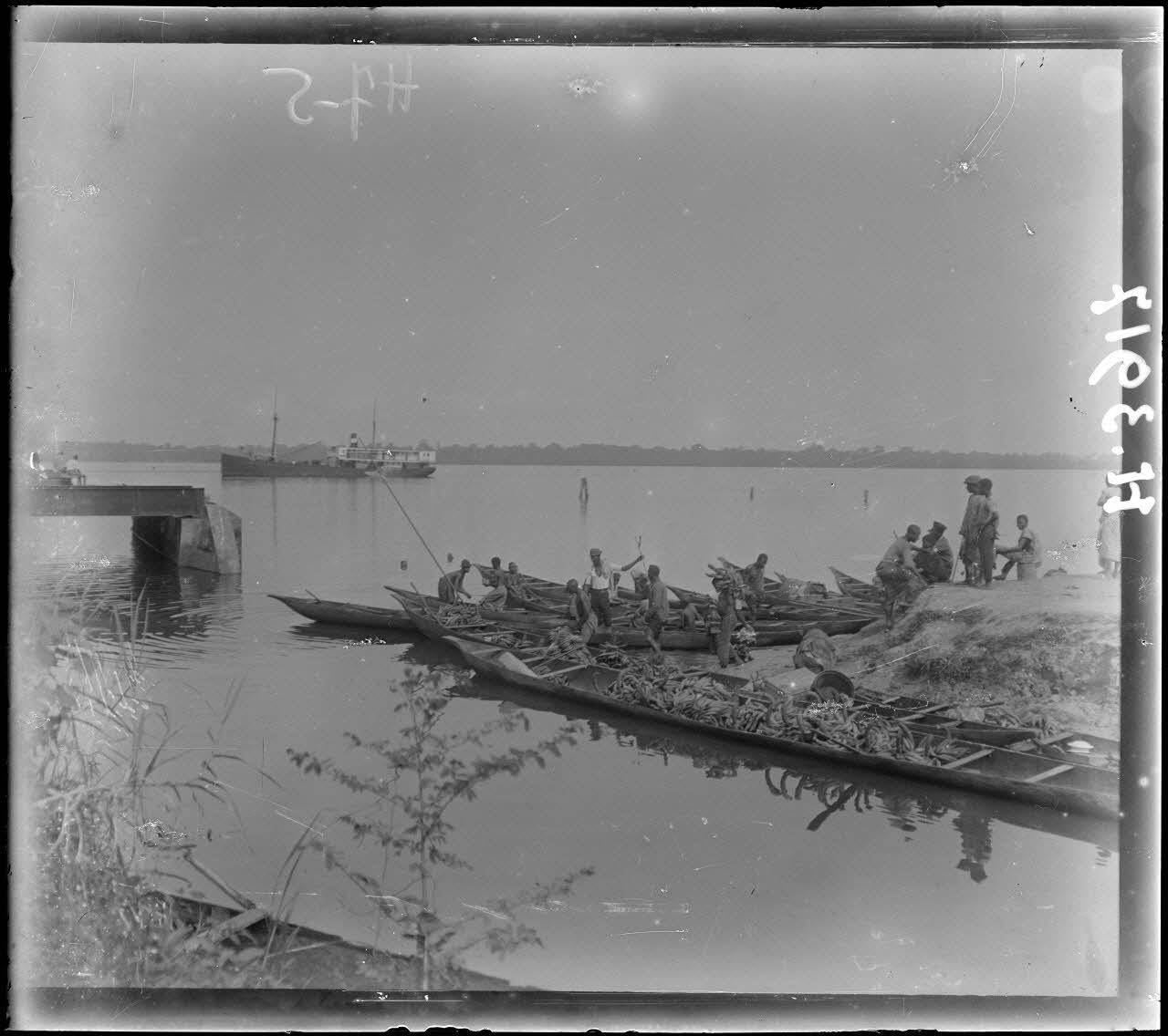 Douala. Le "Méditerranée arrive au port. Marchands de bananes dans pirogue.