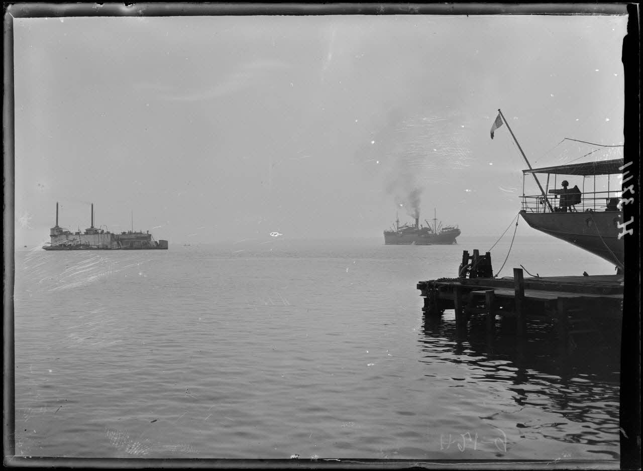 A la gare ferroviaire des voyageurs arrivent à destination et dans le port, des navires sont mouillés près du wharf. Des passagers français arrivent et débarquent sur le wharf.