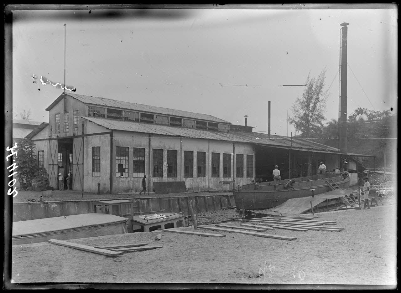 - Sur les docks flottants, près des dragues, le bâtiment "Odin" (qui cherche à couler la canonnière anglaise "Dwarf" en octobre 1914) est en cours de réparation. Sur les quais, les ateliers assistent les réparations. Dans la scierie, une bille de bois est hissée puis mise sur un chariot