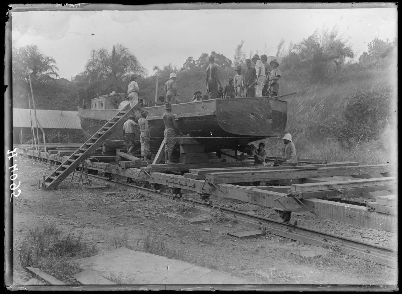 Douala. Réparation de l'"Odin" qui chercha à couler la canonnière anglaise Dwarf en octobre 1914. [légende d'origine]