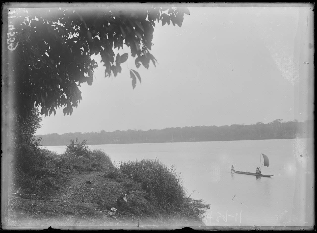 Dans le port, des navires sont au mouillage. Sur les rives de la Sanaga, la végétation est dense et composée d'arbres tropicaux, comme les fromagers.