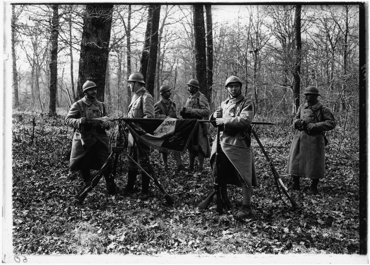 152e Régiment d'Infanterie posant avec son drapeau. Légende extraite du volume " 1914-1919, La Guerre, 150 planches artistiques de la Collection Personnelle du Commandant Tournassoud, ex-Directeur du Service Photographique et Cinématographique de Guerre. Préface autographe du Maréchal Pétain ", Service Commercial et de Vente Argence & Vidal, Lyon, 1920, planche 139.