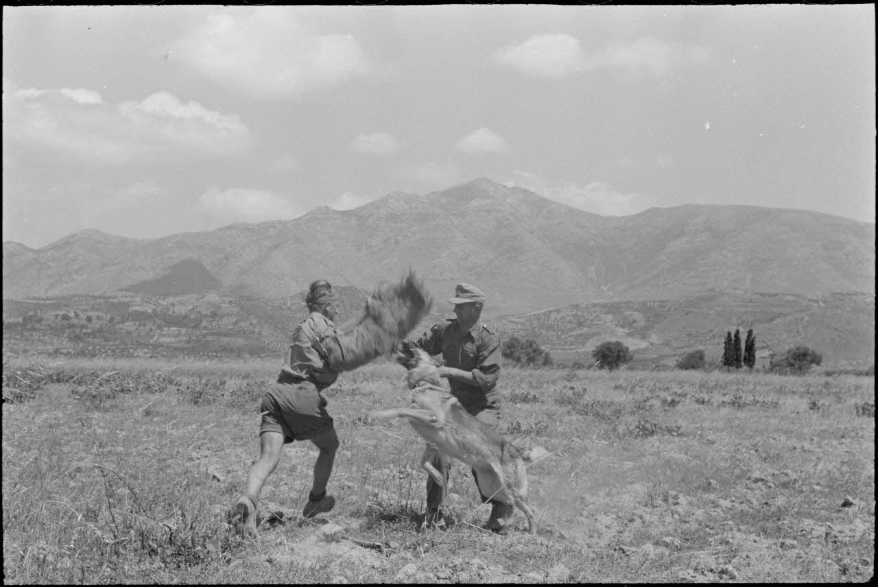 A proximité du terrain d'aviation de Kastelli, le dressage de bergers allemands de la compagnie cynophile.