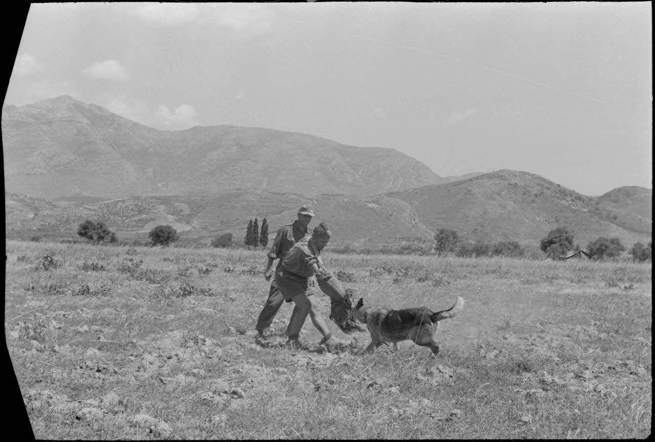 A proximité du terrain d'aviation de Kastelli, le dressage de bergers allemands de la compagnie cynophile.