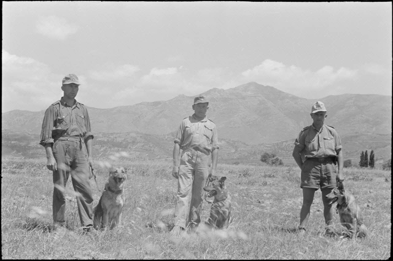A proximité du terrain d'aviation de Kastelli, le dressage de bergers allemands de la compagnie cynophile.