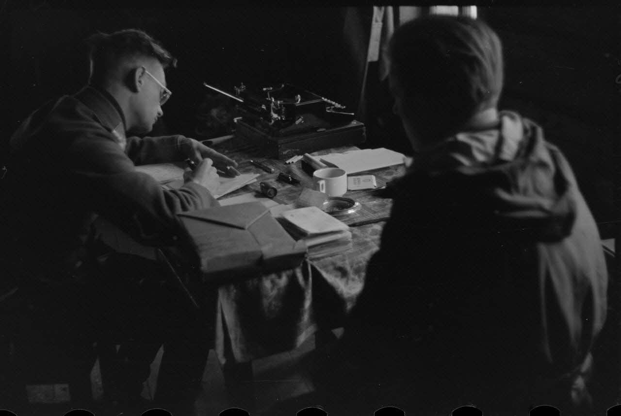 Durant la retraite allemande (Opération Büffelbewegung), dans le secteur de Wjasma (Viazma), le bureau d'un officier de la Luftwaffe improvisé dans une isba.