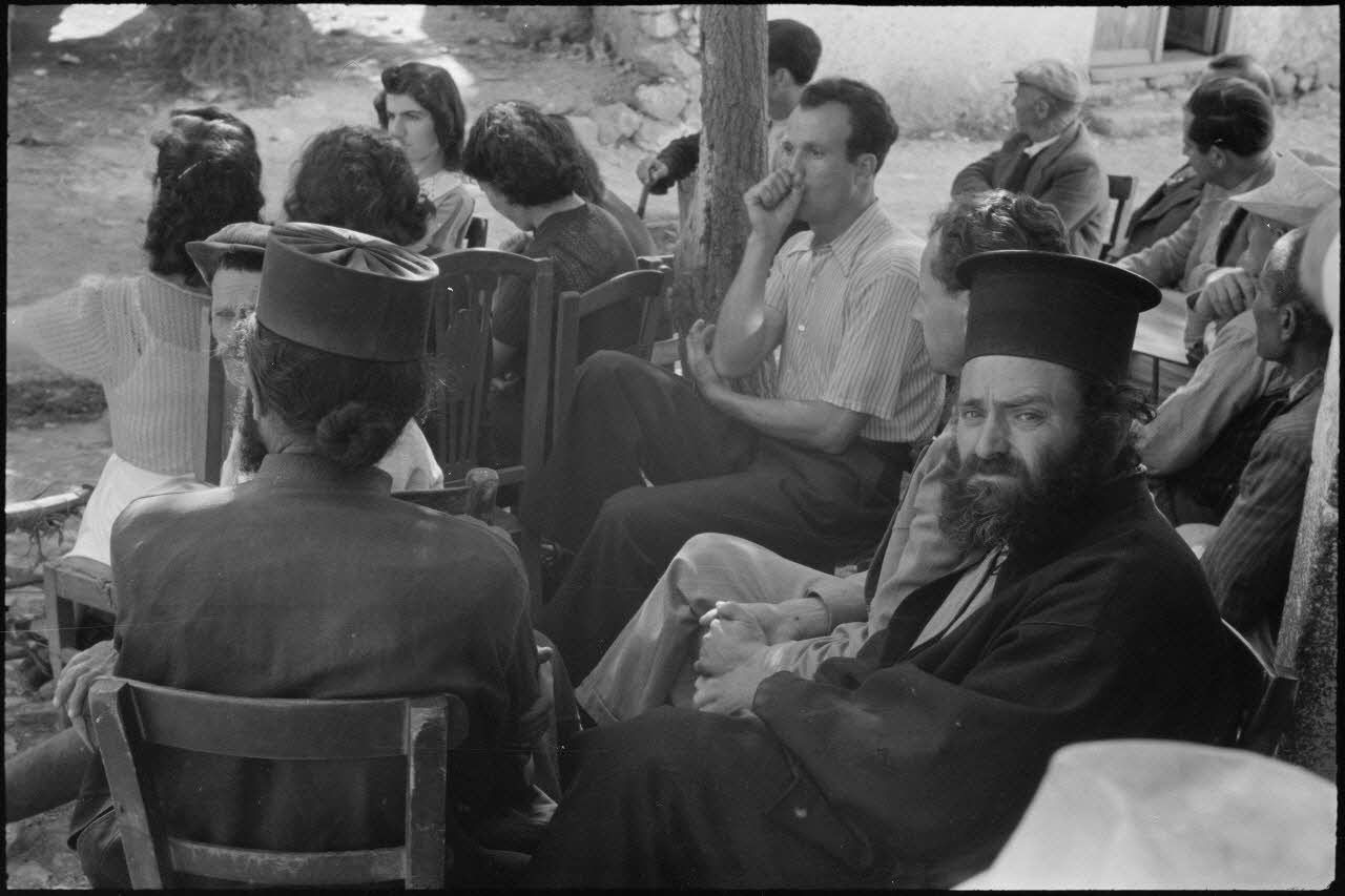 Durant un concert de la musique militaire de la Luftwaffe devant le foyer du soldat de Kastelli auquel la population est invitée, au premier plan deux popes.