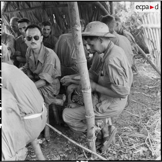 Derniers instants de méditation forcé pour des prisonniers de guerre de l'Union française avant d'être libérés par l'Armée populaire vietnamienne à Viet Tri.