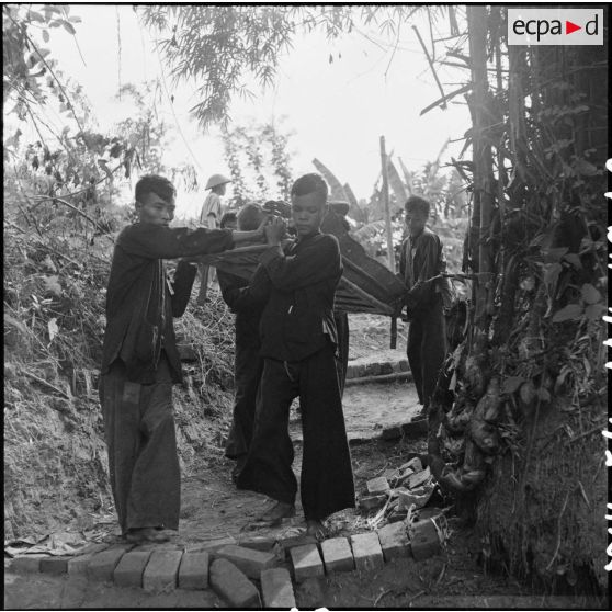 Transport de prisonniers de guerre des troupes de l'Union française sur des brancards au cours d'un échange de prisonniers avec le Vietminh à Viet Tri.
