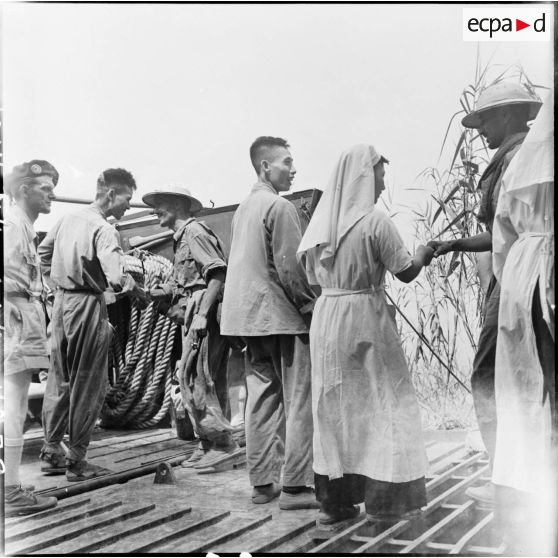 Des soldats de l'Union française donnent une dernière poignée de main aux infirmiers et infirmières de l'Armée populaire vietnamienne avant de monter sur le bateau lors de leur libération à Viet Tri.