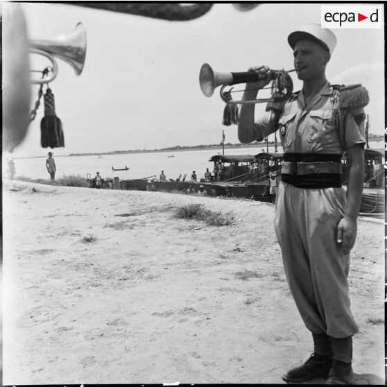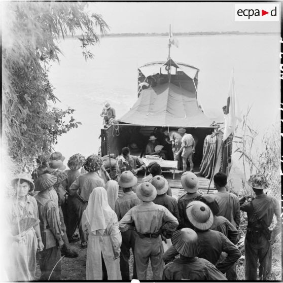 Arrivée d'un chaland de débarquement à l'embarcadère de Viet Tri dans le cadre de la libération de prisonniers des troupes de l'Union française par le Vietminh.