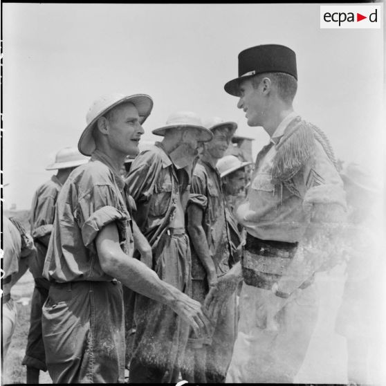 Au cours d'une halte à Sontay, une compagnie de Légion étrangère rend les honneurs aux soldats de l'Union française libérés par l'Armée populaire vietnamienne et en cours de rapatriement vers Hanoï.