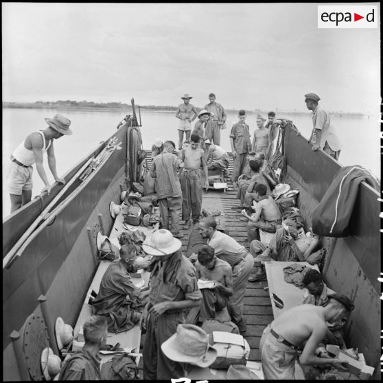 Prisonniers de guerre de l'Union française libérés par l'Armée populaire vietnamienne installés dans la cuve d'un chaland de débarquement au cours de leur rapatriement vers Hanoï.