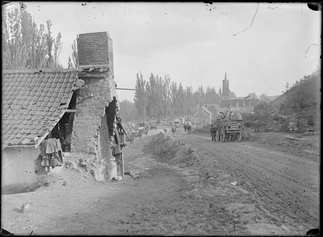 Un camp est installé près du village en ruines de Suzanne. Des troupes convoyées en autocamions traversent la grande rue du village.
