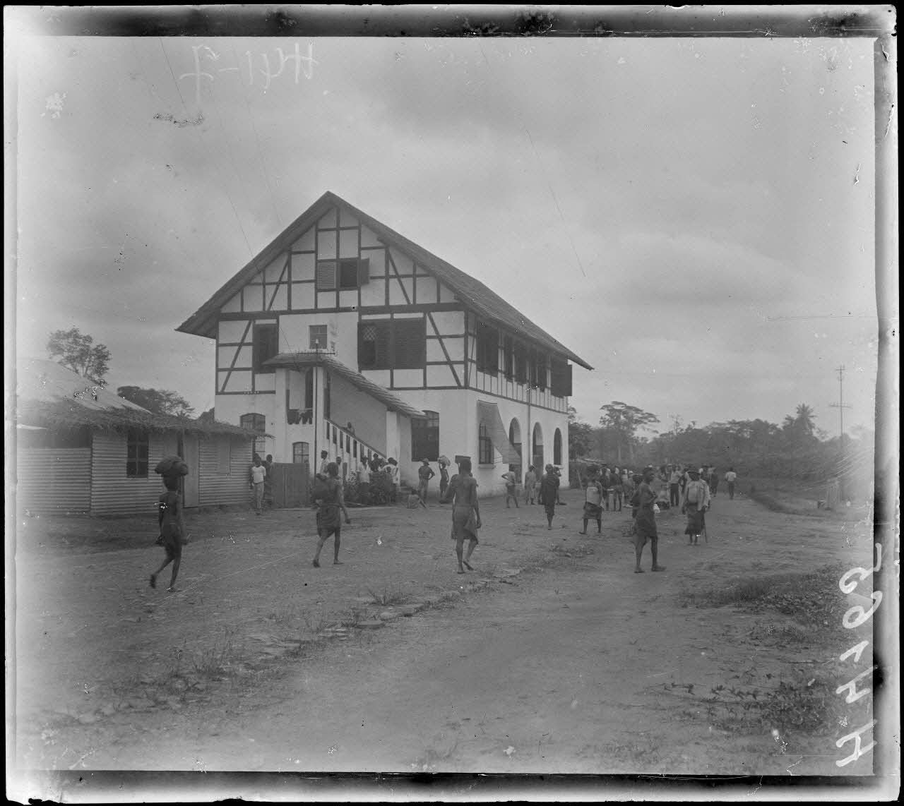- Des tirailleurs entretiennent un blockhaus dans la ville d'Edéa. Sur le chemin de fer du centre, un train s'arrête à la halte de Makondo. Des marchands indigènes font leur commerce au coeur de la ville.