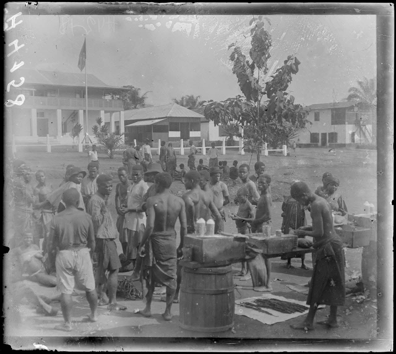 - Des tirailleurs entretiennent un blockhaus dans la ville d'Edéa. Sur le chemin de fer du centre, un train s'arrête à la halte de Makondo. Des marchands indigènes font leur commerce au coeur de la ville.