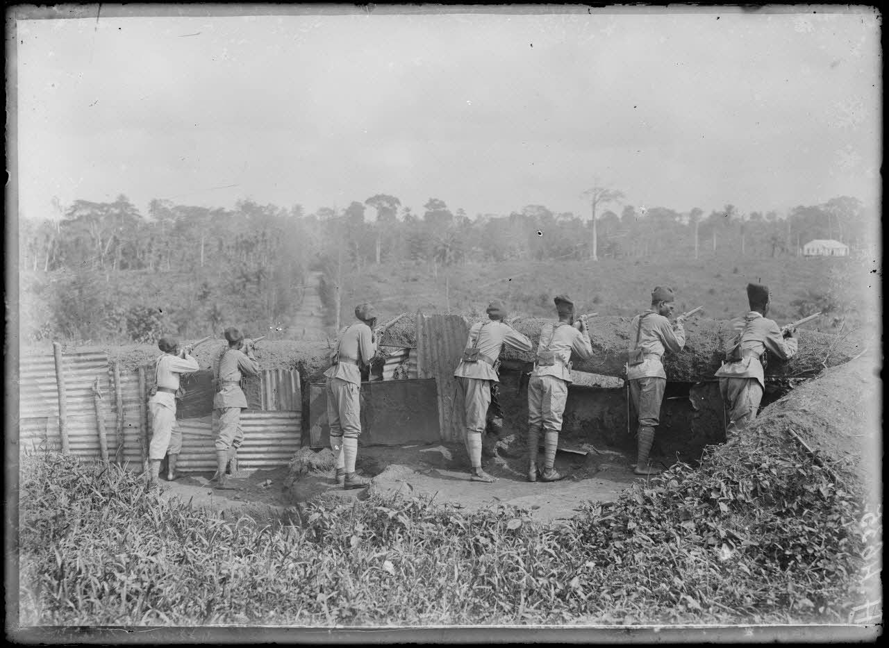 Des tirailleurs prennent la pose avec leurs fusils sur une fortification de terre et de tôle surplombant la route d'accès à la gare d'Edéa.