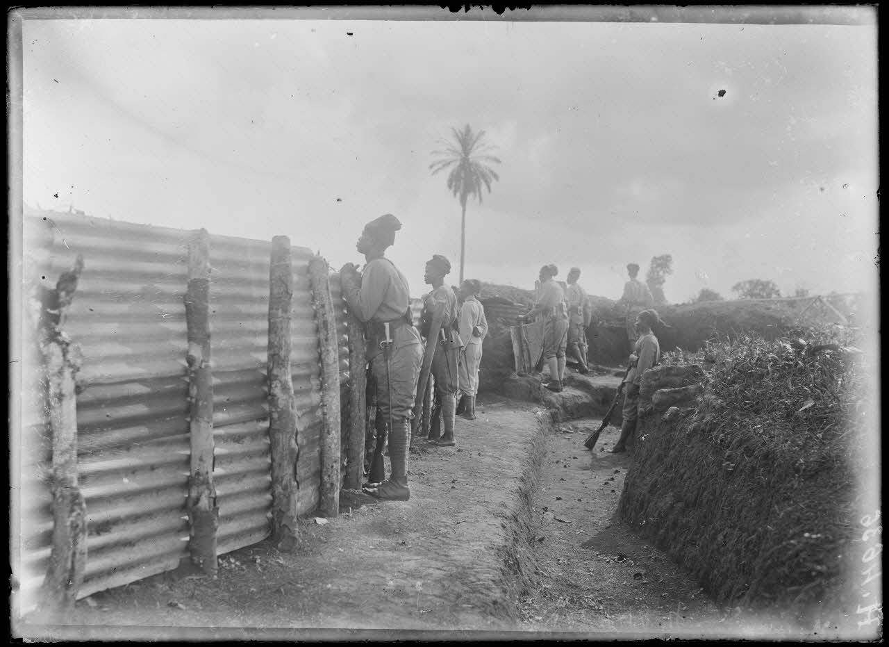 A Edéa, une caravane est arrivée et des hommes livrent les marchandises qu'elle a apportées à la factorerie John Holt. Un ouvrage militaire défend la route de la gare et une tranchée les positions alliées sur le fleuve Sanaga.