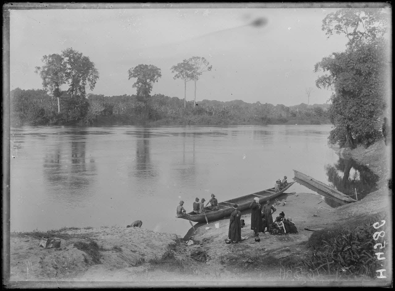 Sur une berge du fleuve Sanaga, des hommes se tiennent dans une pirogue. Des femmes les regardent sur la rive. De grands fromagers poussent de l'autre côté de l'eau.