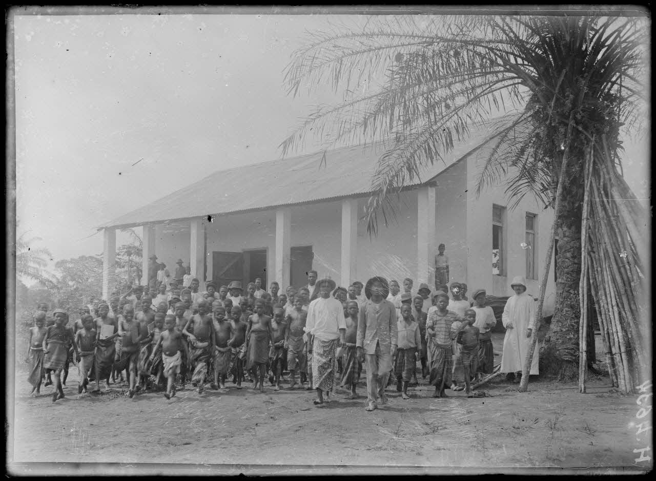 Des enfants sortent en nombre d'une école tenue par des Missionnaires d'Afrique (pères blancs). L'instituteur en soutane blanche et casque colonial se tient sous un palmier et surveille le mouvement.