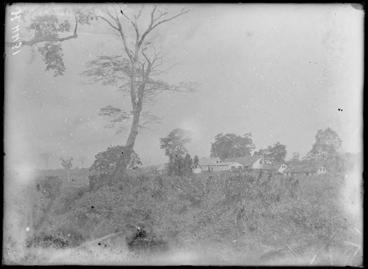 Vue de bâtiments et de maisons de la ville d'Edéa, sur la Sanaga, le long du Chemin de fer du Centre.
