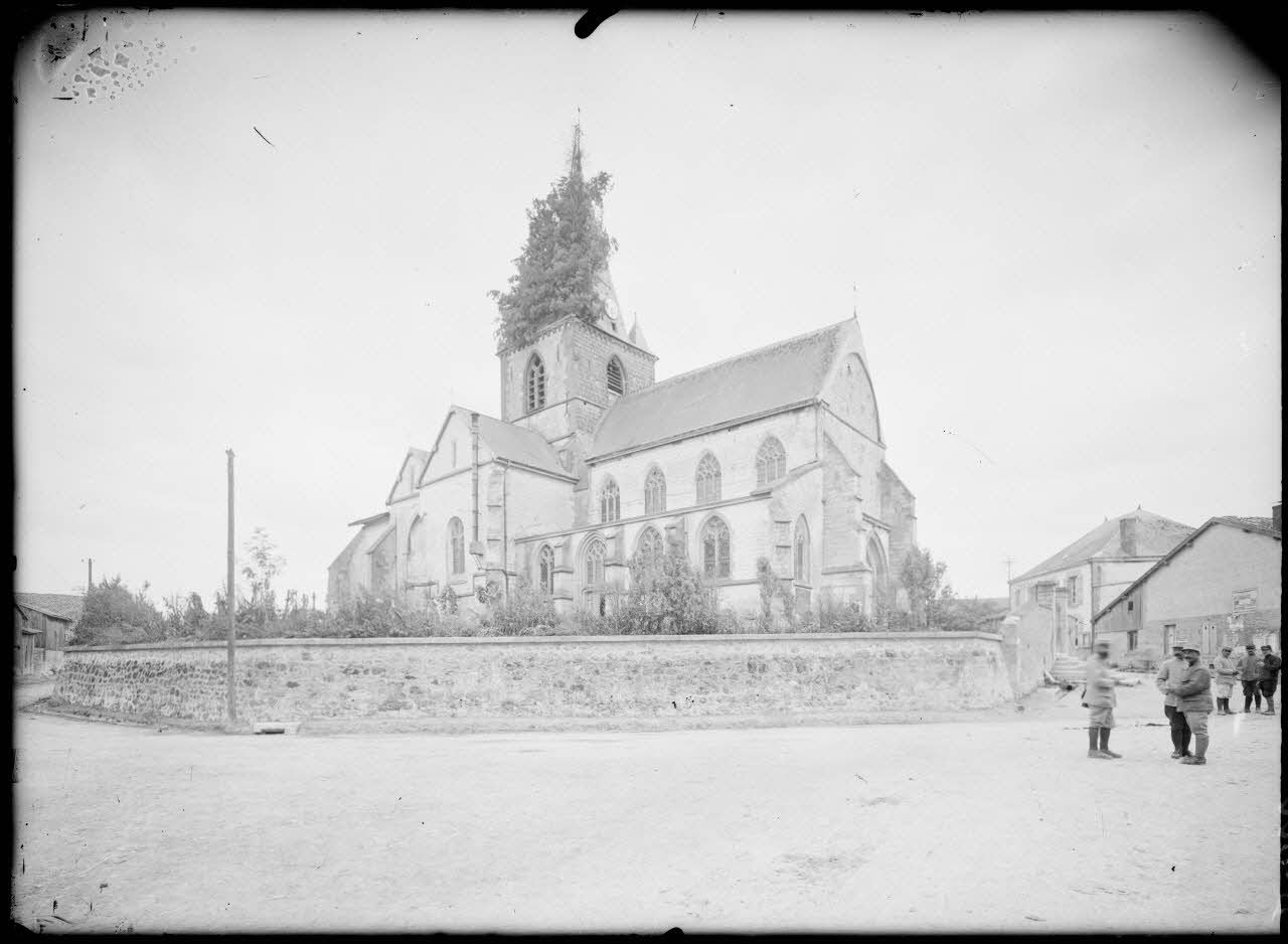 Eglise de Sommesuippe (Marne), avec feuillage sur le clocher pour le dissimuler (4e armée). [légende d’origine]