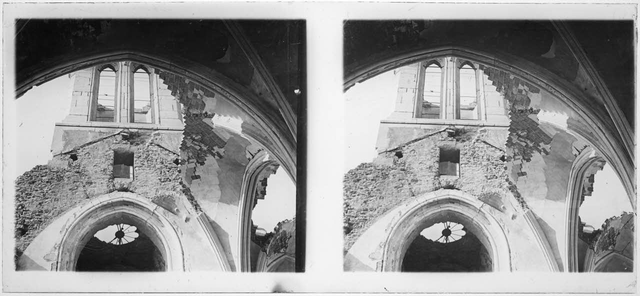 D169-1-91. [Halte devant une église endommagée par les combats].