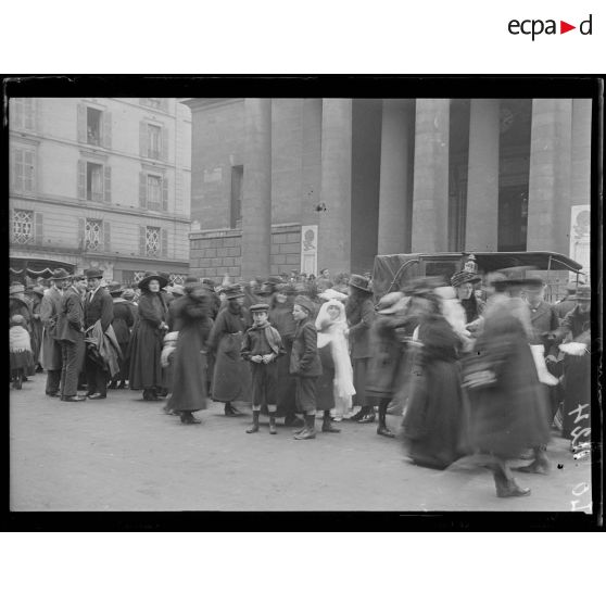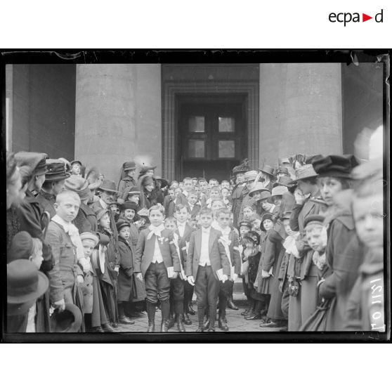 A l'église Saint-Denys du Saint-sacrement, des enfants sortent de l'église après avoir fait leur communion. Les jeunes filles posent devant l'objectif du photographe.