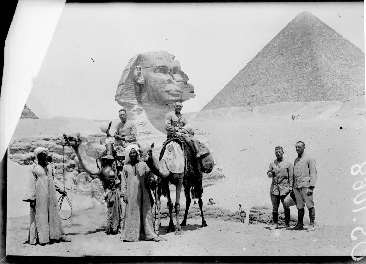 Des soldats anglais et des permissionnaires français visitent les sites archéologiques des pyramides et du Sphinx.
