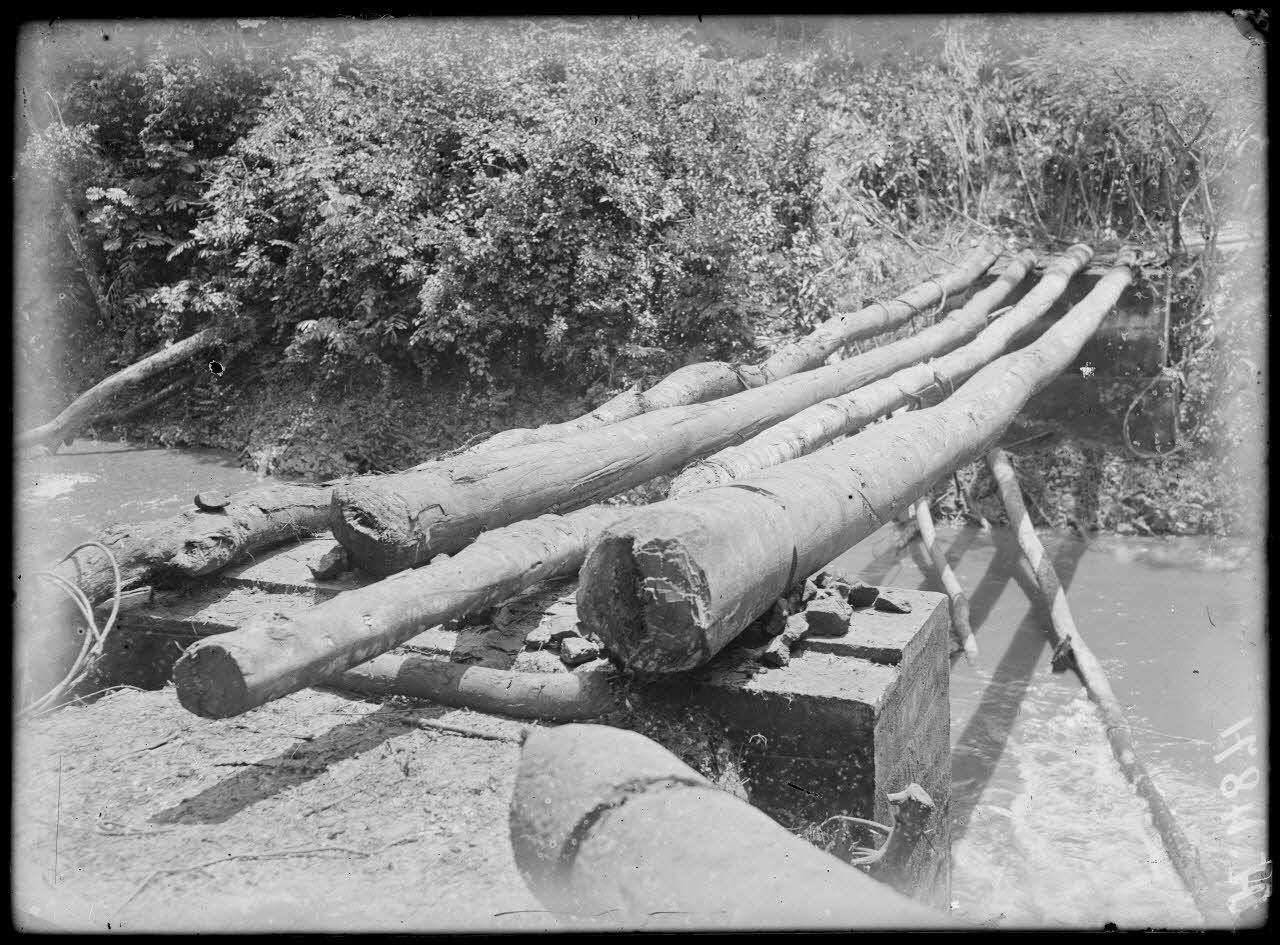 Ekom. Pont sur le N'Kam, d'une portée de 27 mètres, construit avec des moyens de fortune. [légende d'origine]
