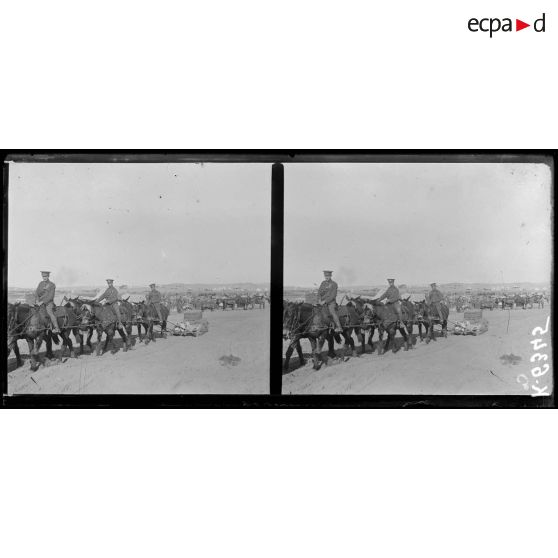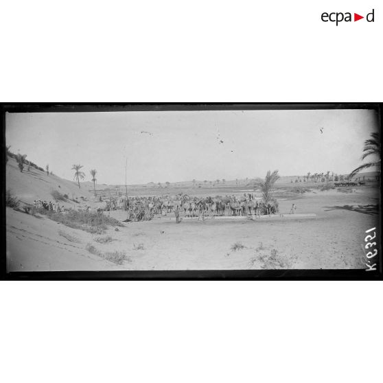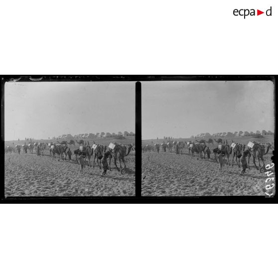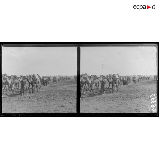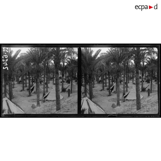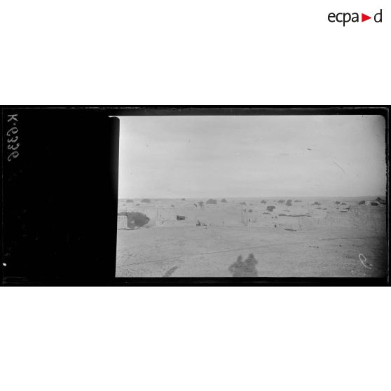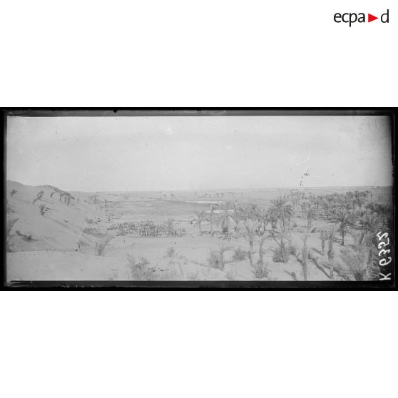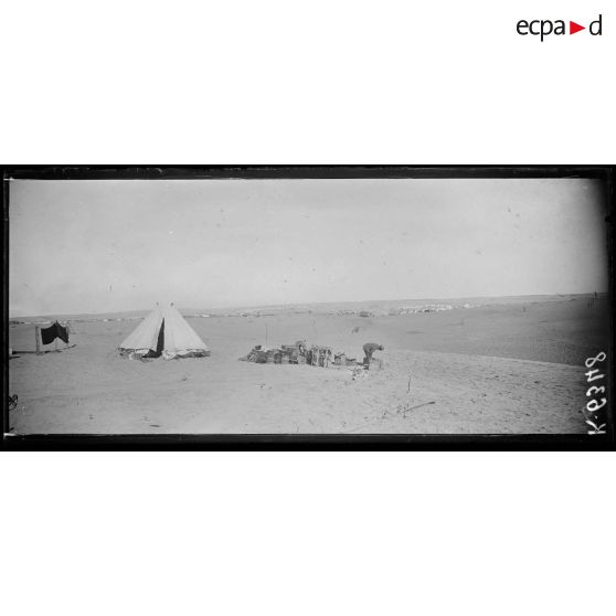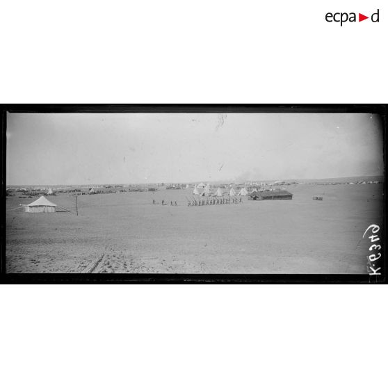 Dans le désert du Sinaï, un camp de prisonniers de guerre a été installé par les troupes alliées. Des prisonniers turcs sont surveillés. La ville d'El Arish a été partiellement détruite par les bombardements.
