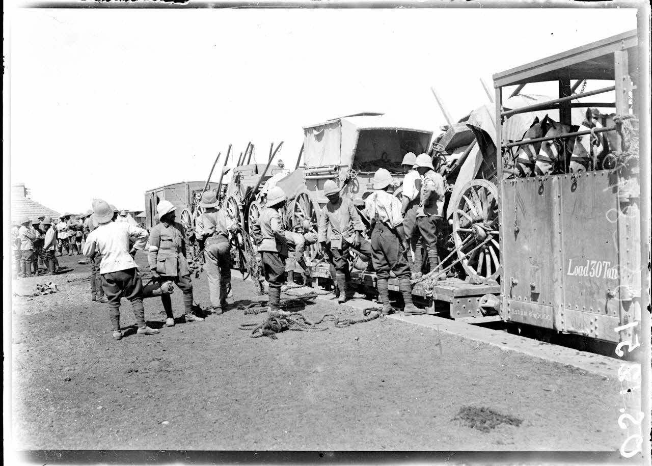 - Gare d'El Kantara : des spahis et des chasseurs d'Afrique embarquant pour le front dans un train, avec matériel et chevaux.