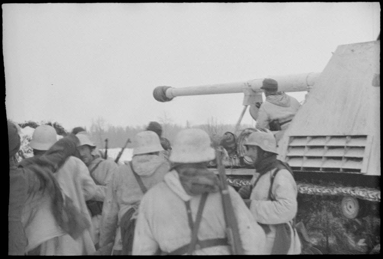Pendant la bataille de Witebsk, des fantassins à l'abri d'une isba, et au premier plan les chenilles d'un Nashorn (Sd.kfz.164) du 519e "bataillon" lourd de chasseurs de chars (s.Pz.Jg.Abt.519, schwere Panzerjäger Abteilung 519).