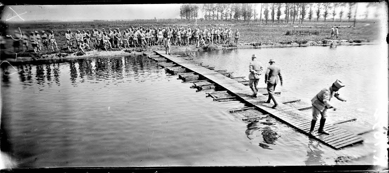 Elsendamme (Belgique), passage d'hommes sur la passerelle. [légende d'origine]