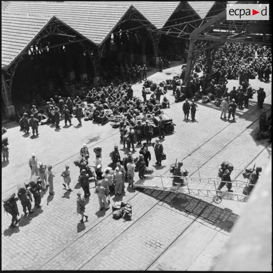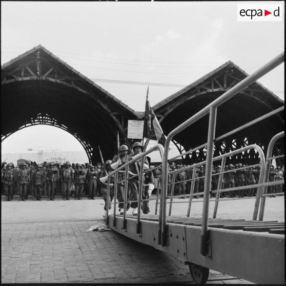 Embarquement au port d'Alger à destination de l'Indochine du 22e RTA (régiment de tirailleurs algériens) sur le paquebot Le Pasteur.