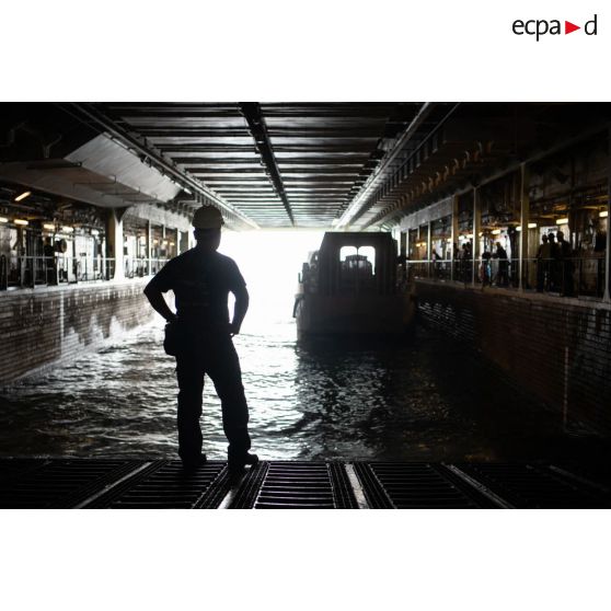 Arrivée de l'engin de débarquement amphibie standard (EDAS) Arbalète (L90100) dans le radier du porte-hélicoptères amphibie (PHA) Tonnerre (L9014) à Dakar, au Sénégal.