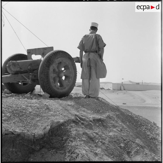 Un légionnaire et un canon de 75 mm Mle 1897 face à Fort Flatters.