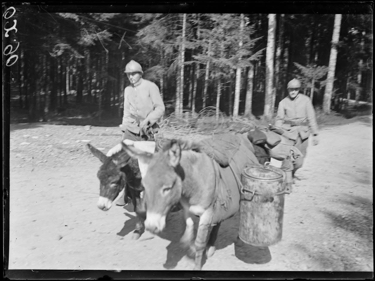 - aux environs du col de La Schlucht , une colonne de mulets dans un chemin forestier effectuant le ravitaillement, l'hôtel au sommet du col, un correspondant de guerre ;