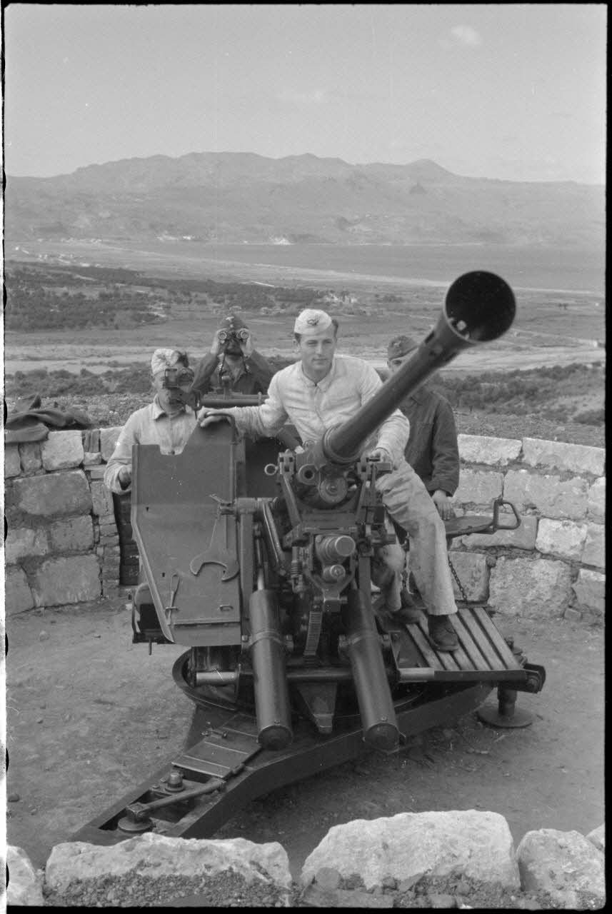 En Crète, le cimetière militaire allemand de Maleme, puis gros plan sur une pièce de DCA de 3,7 cm Flak 36 et des prisonniers.