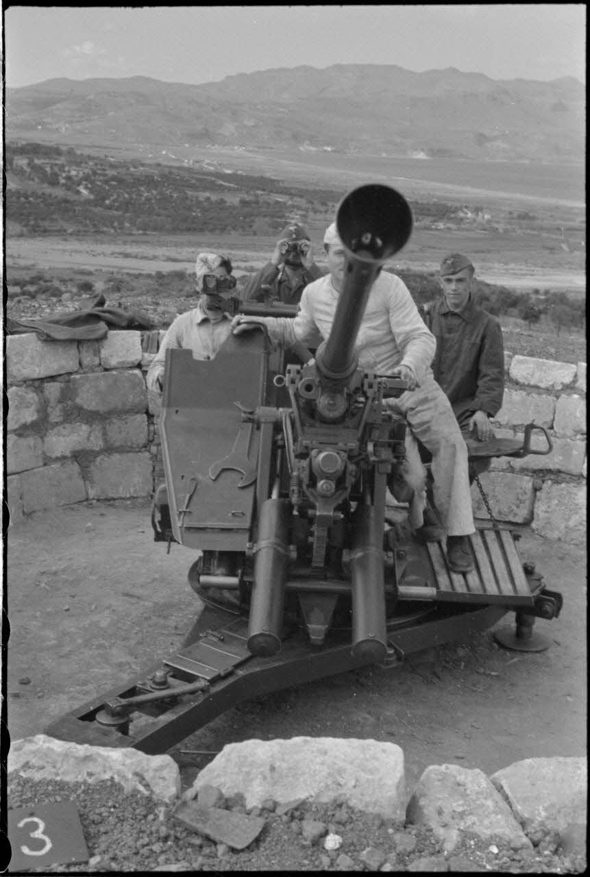En Crète, le cimetière militaire allemand de Maleme, puis gros plan sur une pièce de DCA de 3,7 cm Flak 36 et des prisonniers.
