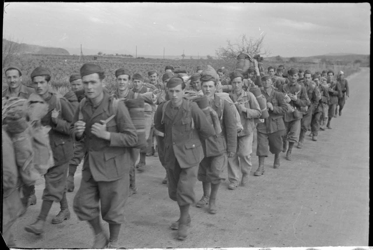 Les prisonniers encadrés par des soldats allemands semblent être issus de l'armée italienne ou grecque.