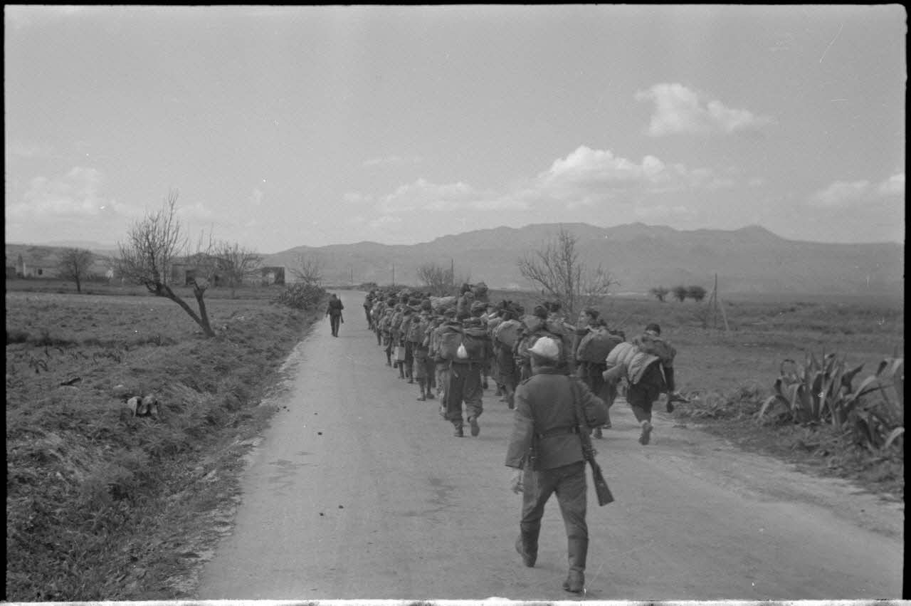 Les prisonniers encadrés par des soldats allemands semblent être issus de l'armée italienne ou grecque.